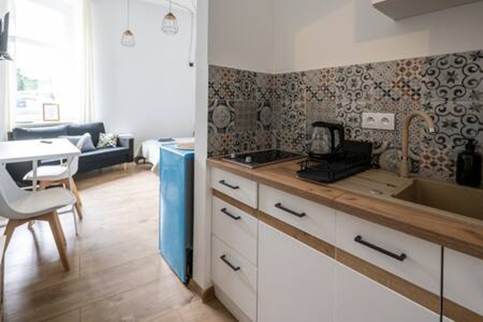 Jasne studio inspirowane latem: turkusowa lodówka, kolorowe płytki i lekkie tkaniny tworzą wakacyjny klimat w centrum miasta. Wygodne łóżko małżeńskie i rozkładana sofa pomieszczą do 4 osób. Aneks kuchenny, szybkie Wi-Fi oraz Smart TV z Netflixem sprzyjają relaksowi po dniu zwiedzania. Blisko komunikacja miejska, restauracje i parki – idealne na letni city break lub dłuższy pobyt.