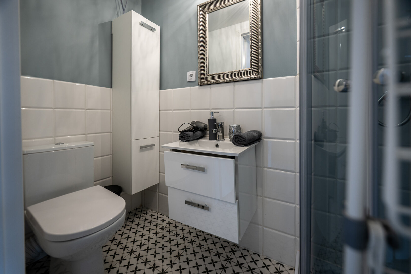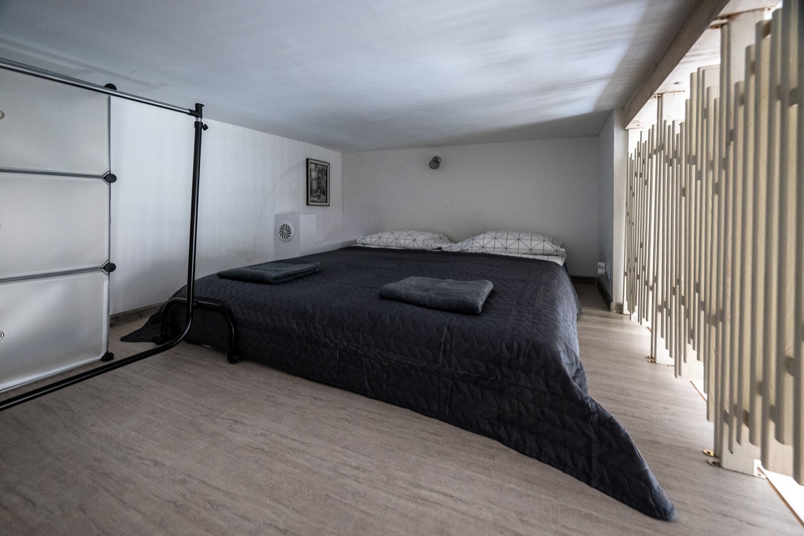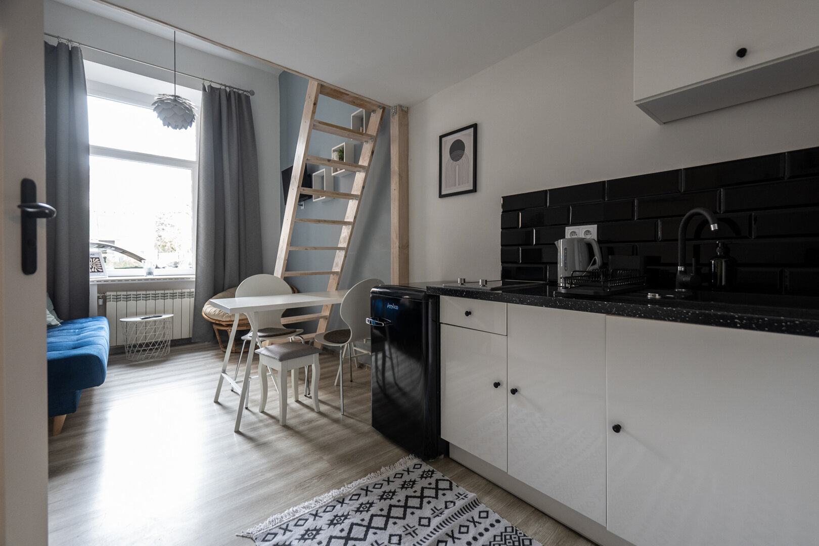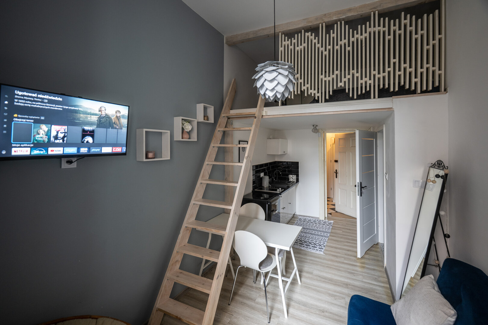 Nowoczesny loft inspirowany zimą – chłodne szarości, granatowa sofa i biało-czarne akcenty tworzą klimat zimowego city breaku. Na antresoli wygodne podówjne łóżko, na dole rozkładana sofa, stół do pracy lub posiłków oraz w pełni wyposażony aneks kuchenny. Stylowa łazienka z prysznicem, szybkie Wi-Fi i Smart TV z Netflixem sprawiają, że to idealne miejsce na wieczorny chill po dniu w mieście.
