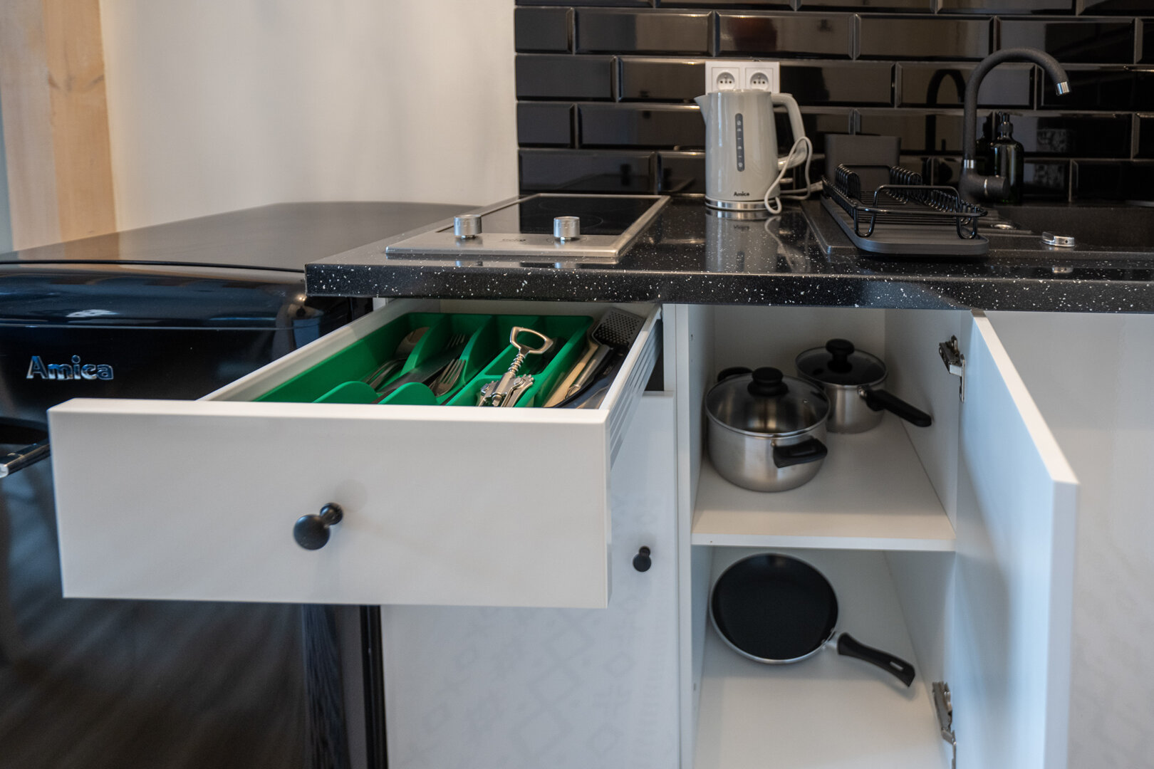 Jasne studio inspirowane latem: turkusowa lodówka, kolorowe płytki i lekkie tkaniny tworzą wakacyjny klimat w centrum miasta. Wygodne łóżko małżeńskie i rozkładana sofa pomieszczą do 4 osób. Aneks kuchenny, szybkie Wi-Fi oraz Smart TV z Netflixem sprzyjaj