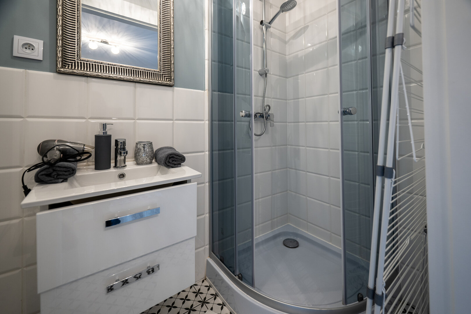 Mieszkanie wyposażone jest w żelazko, deskę do prasowania i suszarkę do ubrań,
