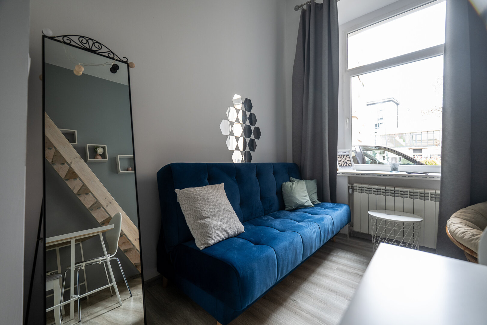 Nowoczesny apartament w sercu Łodzi, urządzony w stylu marynistycznym z dominującym kolorem głębokiego błękitu. Jasne wnętrze, w pełni wyposażona kuchnia, balkon oraz szybki internet sprawiają, że to idealne miejsce na pobyt zarówno turystyczny, jak i biz
